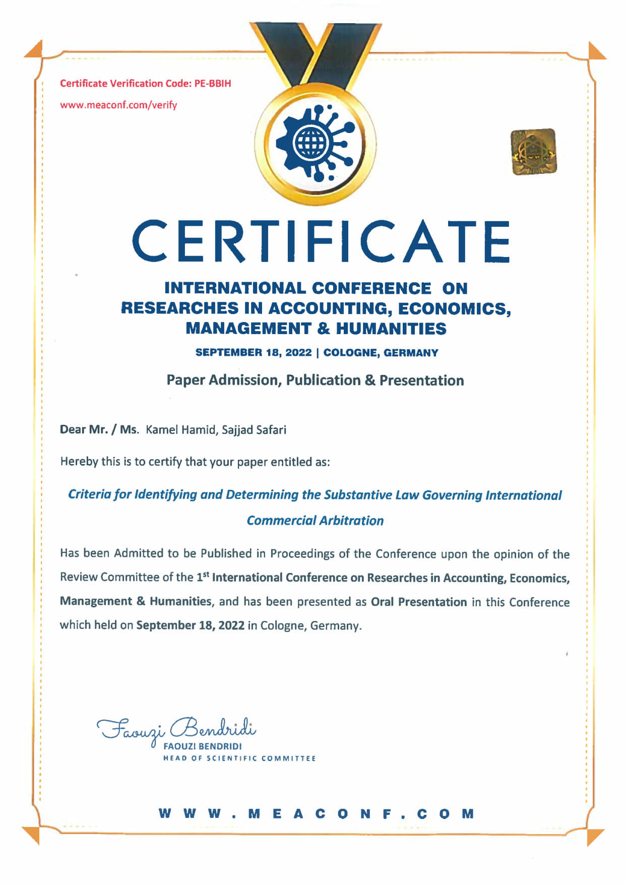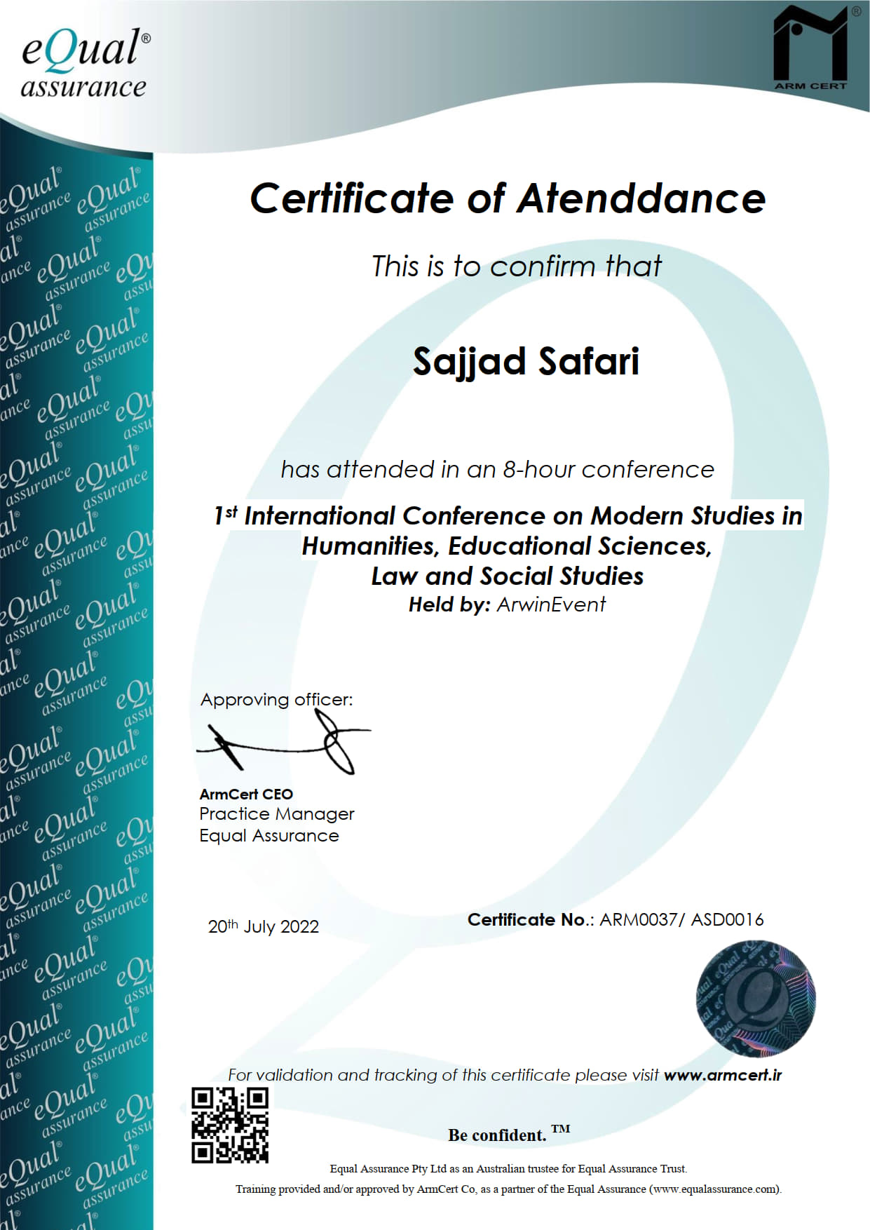 Certificate of the first international conference of modern studies in humanities, educational sciences, law and social studies